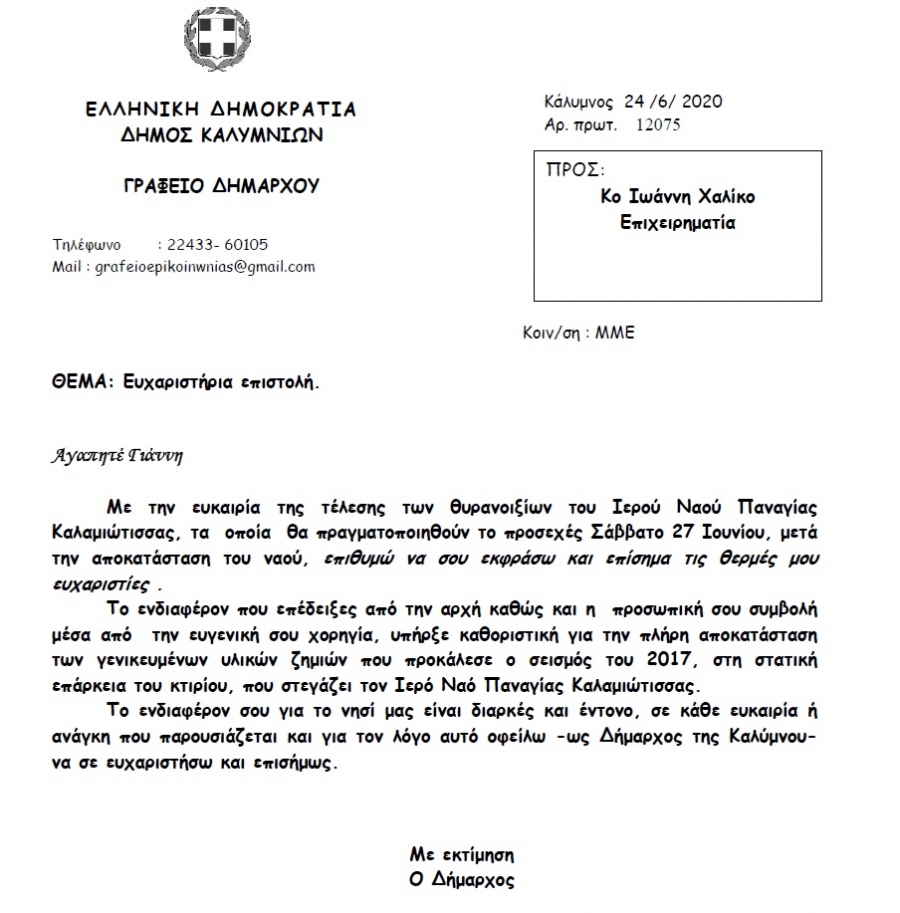 Ευχαριστήρια επιστολή Δημάρχου προς κ. Ιωάννη Χαλίκο